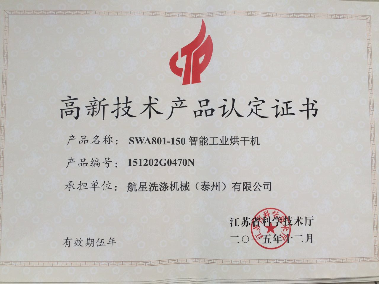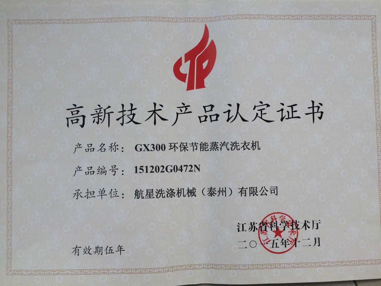 高新證書-蒸汽洗衣機